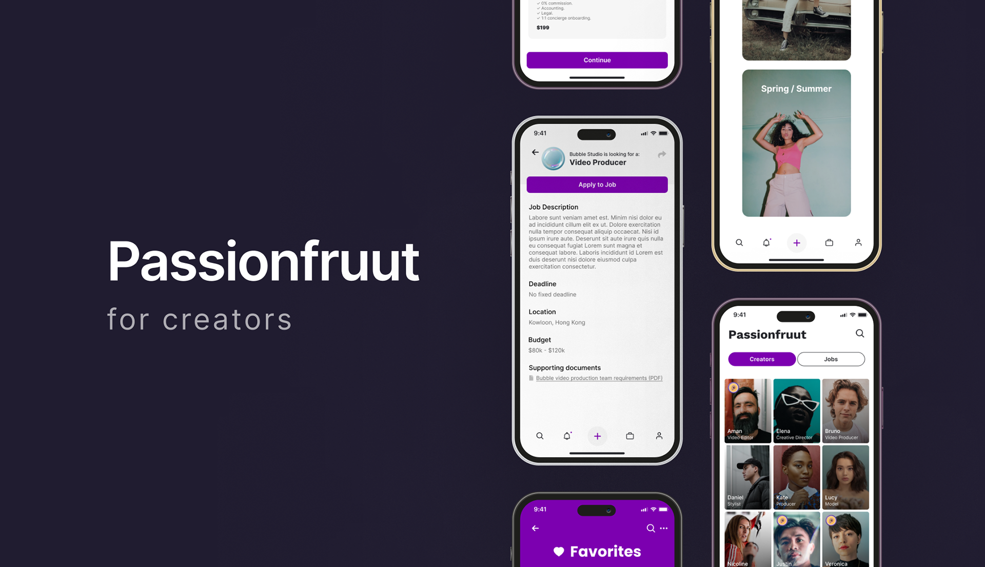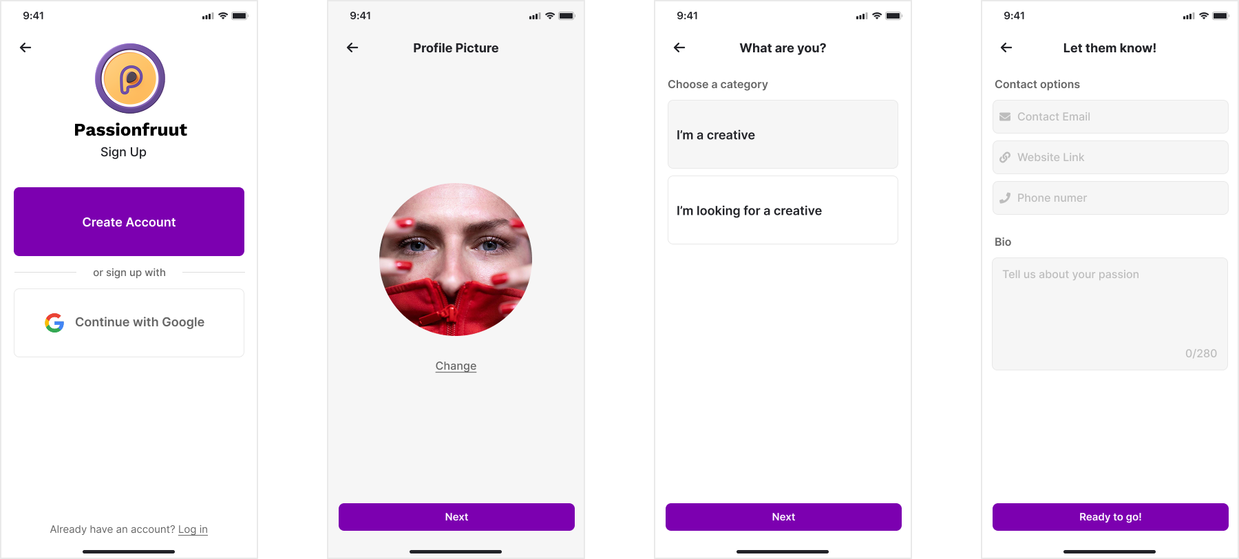 Passionfruut is a video-first mobile app designed to help creatives discover, connect, and collaborate with people who share their interests and creative goals. The product explores a more human approach to creative networking by prioritizing expression, relevance, and real-world connection over static profiles and traditional social metrics.