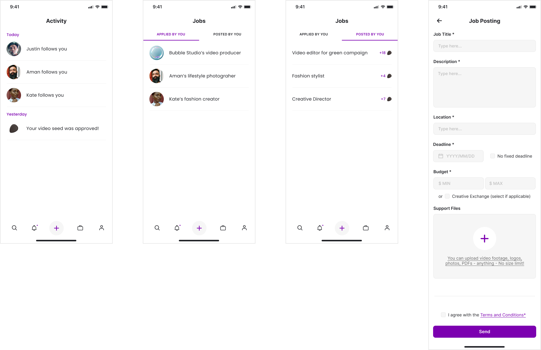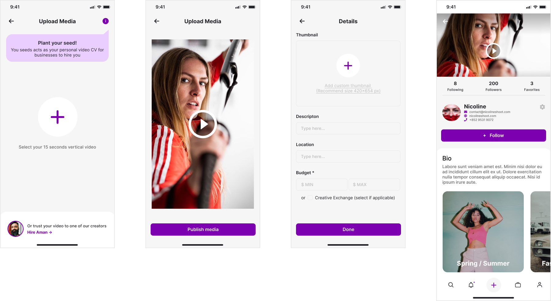 Profile: Profiles are designed to showcase creative identity through video, portfolio content, and personal context, allowing users to express both their work and personality.